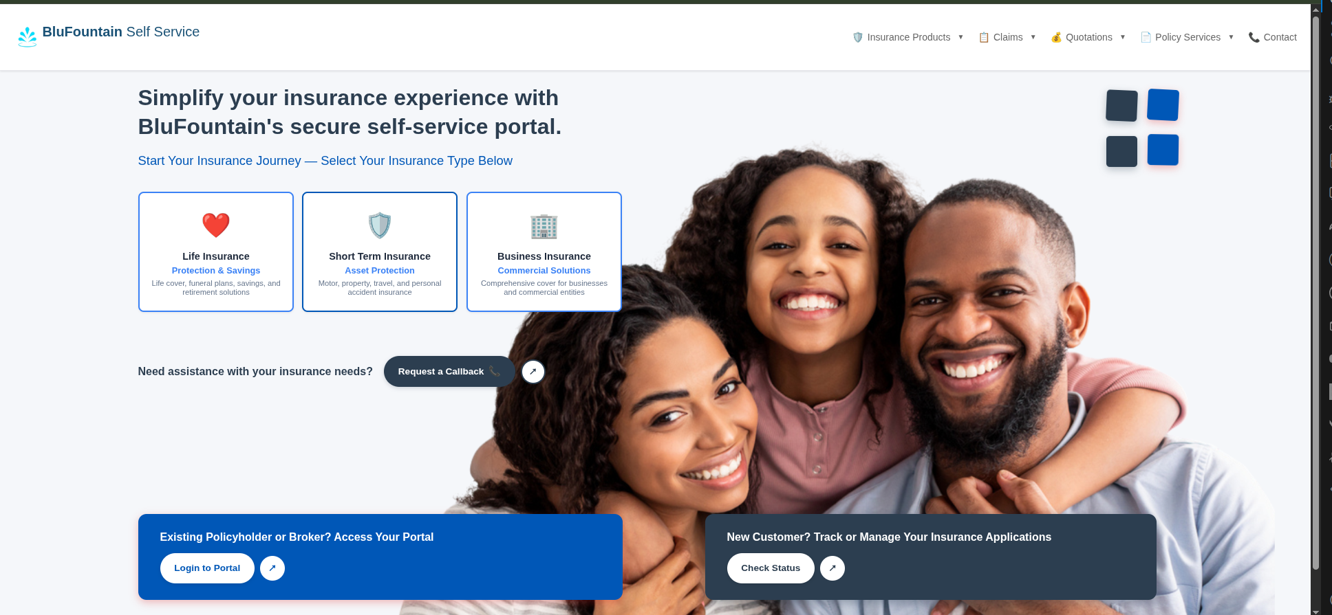 Blufontain Insure is a comprehensive insurance platform designed to streamline policy management, underwriting, and claims processing. Built with React and a Spring Boot API backend, it provides a secure and intuitive experience for administrators, agents, and policyholders. The solution includes real-time data dashboards, policy generation, secure authentication (JWT), and RESTful APIs for third-party integrations.